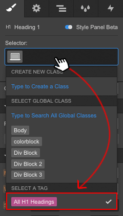 Välj en rubrik eller paragraf, klicka på "Select a class or tag" och välj t.ex. "All H1 Headings" eller "All paragraphs" som syns längst ner i listan.